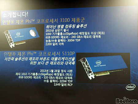 ÇÑÆí, Á¦¿Â ÆÄÀÌ 3100 ½Ã¸®Áî¿Í ÇÔ²² Ãâ½ÃµÇ¾ú´ø Á¦¿Â ÆÄÀÌ 5110P ¸ðµ¨Àº 60ÄÚ¾î¿Í GDDR5 8GB ¸Þ¸ð¸®(´ë¿ªÆø 320GB/s), TDP 225W·Î 1.01Å×¶óÇ÷ӽºÀÇ ´õºí ÇÁ¸®½ÃÀü ¼º´ÉÀ» ¹ßÈÖÇßÀ¸¸ç, ±ÇÀå ¼ÒºñÀÚ°¡°ÝÀº 2649´Þ·¯ÀÌ´Ù.