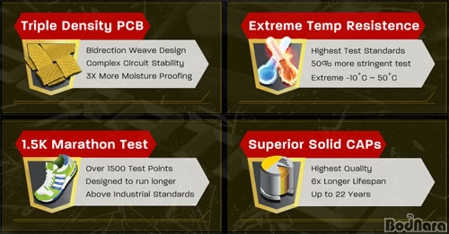 Extreme Temp Resistence´Â, ÀÏ¹Ý ¸ÞÀκ¸µåÀÇ ¿Âµµ ¹üÀ§º¸´Ù 10µµ °¡·® Çâ»óµÈ -10¡É ~ 50¡É±îÁö¿¡¼ »ç¸· ±âÈÄ/ ½À±âÂù ȯ°æ/ ±Ø³Ã ȯ°æ¿¡¼ÀÇ Å×½ºÆ®¸¦ °ÅÄ¡°Ô µÈ´Ù.