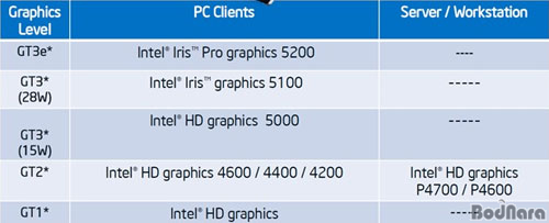 techreport¸¦ ÀοëÇÑ techpowerupÀº GT3 28W ¹öÀü°ú GT3e´Â °¢°¢ ¾ÆÀ̸®½º (Iris)¿Í ¾ÆÀ̸®½º ÇÁ·Î (Iris Pro)ÀÇ ³×À̹ÖÀ» Àû¿ëÇØ HD Iris Graphics 5100, HD Iris Pro Graphics 5200ÀÇ ³×À̹ÖÀ» »ç¿ëÇÒ °ÍÀ̶ó°í ÀüÇß´Ù.