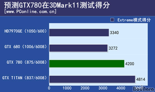 ÁöÆ÷½º GTX 780ÀÇ ¼º´ÉÀº ÁöÆ÷½º GTX 680 ´ëºñ 25%°¡ Çâ»óµÉ °ÍÀ¸·Î ¾Ë·ÁÁø °¡¿îµ¥ 3DMark 11 ½ºÄھ °ø°³µÇ¾ú´Ù. °ø°³µÈ Ç¥¿¡¼ ÁöÆ÷½º GTX 780Àº ·¹ÆÛ·±½ºº¸´Ù ³ôÀº º£À̽º 875MHz°¡ Àû¿ëµÇ´Â °ÍÀ¸·Î È®ÀεǸç ÁöÆ÷½º ŸÀÌź°ú ÁöÆ÷½º GTX 680 »çÀÌÀÇ ¼º´É, ÁöÆ÷½º GTX 680°ú´Â Â÷À̰¡ ²Ï Å©°Ô ³ªÅ¸³µ´Ù. ÁöÆ÷½º GTX 680º¸´Ù ¾à 28% Çâ»ó, ÁöÆ÷½º ŸÀÌźÀº ÁöÆ÷½º GTX 780º¸´Ù ¾à 15% ³ôÀº ½ºÄھ Á¦°øÇÑ´Ù.