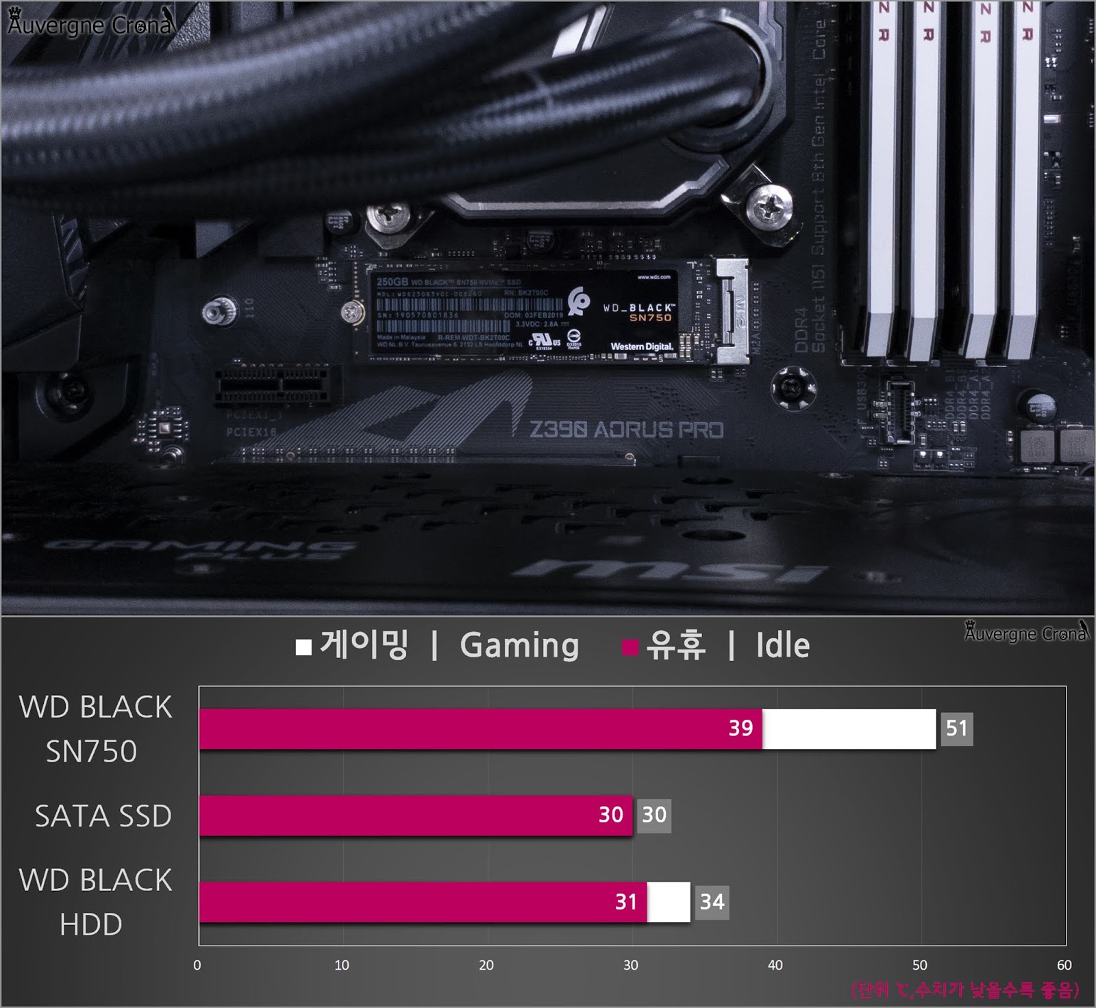 ¡ã ¾à 1~2½Ã°£ Á¤µµ, ¸ÅÄ¡¸¦ ¸ðµÎ Ç÷¹ÀÌÇÏ°í ³­ ÈÄ, °¢ ÀúÀå ÀåÄ¡ÀÇ ¿Âµµ¸¦ ÃøÁ¤Çß½À´Ï´Ù. ÃøÁ¤ ÇÁ·Î±×·¥Àº CPUID HWMonitor°¡ »ç¿ëµÇ¾ú½À´Ï´Ù. SATA SSD¿Í HDD´Â ÄÉÀ̽º ÇÏ´Ü¿¡¼­ º°µµÀÇ Äð¸µÀ» ¹ÞÁö¸¸, SN750Àº ÇÁ·Î¼¼¼­ ¹Ù·Î ¾Æ·¡¿¡ ÀåÂøµÇ¾î ÀÖ¾î, ¾Æ¹«·¡µµ ¹ß¿­À» ÇØ¼ÒÇϱ⠽±Áö ¾Ê½À´Ï´Ù. ±×·³¿¡µµ ºÒ±¸Çϰí, °ÔÀÌ¹Ö ½Ã ÃÖ´ë 51µµ¸¦ ±â·ÏÇßÀ¸¸ç, À¯ÈÞ ½Ã¿¡´Â 39µµ·Î ÃøÁ¤µÇ¾ú½À´Ï´Ù. ÇØ´ç ¸ðµ¨Àº ¹æ¿­ÆÇÀÌ Å¾ÀçµÇÁö ¾ÊÀº ¸ðµ¨·Î, 500GB¿Í 1TB ÀÌ»óºÎÅÍ EKWBÀÇ ¹æ¿­ÆÇÀÌ ¿É¼ÇÀ¸·Î ´Þ¸®±â ¶§¹®¿¡, ¿Âµµ¿¡ ¹Î°¨ÇϽôٸé Àû±Ø Ãßõµå¸³´Ï´Ù. ¸ÞÀκ¸µå¿¡ µ¿ºÀµÈ ¹æ¿­ÆÇÀ¸·Îµµ ÃøÁ¤ÇغÃÀ¸¸ç, ÃÖ°í 45µµ¸¦ ±â·ÏÇß½À´Ï´Ù.