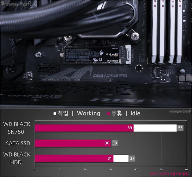 ¡ã ¸ðµç ¼Óµµ ÃøÁ¤ÀÌ ³¡³ª°í ³ ÈÄ, °¢ ÀúÀå ÀåÄ¡ÀÇ ¿Âµµ¸¦ ÃøÁ¤Çß½À´Ï´Ù. ÃøÁ¤ ÇÁ·Î±×·¥Àº CPUID HWMonitor°¡ »ç¿ëµÇ¾ú½À´Ï´Ù. SATA SSD¿Í HDD´Â ÄÉÀ̽º ÇÏ´Ü¿¡¼ º°µµÀÇ Äð¸µÀ» ¹ÞÁö¸¸, SN750Àº ÇÁ·Î¼¼¼ ¹Ù·Î ¾Æ·¡¿¡ ÀåÂøµÇ¾î ÀÖ¾î, ¾Æ¹«·¡µµ ¹ß¿À» ÇØ¼ÒÇϱ⠽±Áö ¾Ê½À´Ï´Ù. ±×·³¿¡µµ ºÒ±¸Çϰí, ÃøÁ¤ ½Ã ÃÖ´ë 56µµ¸¦ ±â·ÏÇßÀ¸¸ç, À¯ÈÞ ½Ã¿¡´Â 39µµ·Î ÃøÁ¤µÇ¾ú½À´Ï´Ù. ÇØ´ç ¸ðµ¨Àº ¹æ¿ÆÇÀÌ Å¾ÀçµÇÁö ¾ÊÀº ¸ðµ¨·Î, 500GB¿Í 1TB ÀÌ»óºÎÅÍ EKWBÀÇ ¹æ¿ÆÇÀÌ ¿É¼ÇÀ¸·Î ´Þ¸®±â ¶§¹®¿¡, ¿Âµµ¿¡ ¹Î°¨ÇϽôٸé Àû±Ø Ãßõµå¸³´Ï´Ù. ¶Ç, SN750Àº ¿ë·®ÀÌ Ä¿Áú¼ö·Ï, ¾²±â ¼Óµµ°¡ Çâ»óµÇ±â ¶§¹®¿¡, 250GBÀÇ ¼º´É Â÷À̸¦ È®ÀÎÇϼ̴ٸé, ±× ÀÌ»óÀÇ Á¦Ç°µµ °í·ÁÇØº¸½Ã±æ ¹Ù¶ø´Ï´Ù.