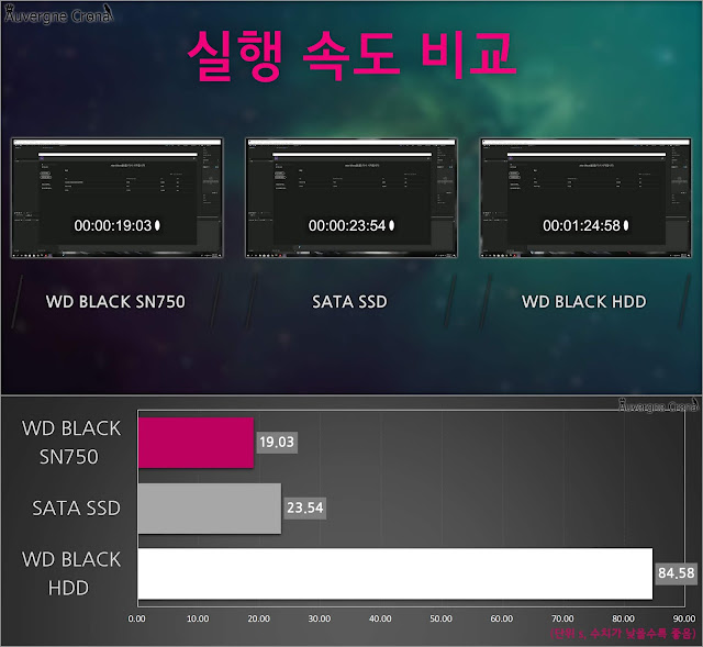 ¡ã NVMe SSDÀÎ WD BLACK SN750°ú SATA SSD, ±×¸®°í WD BLACK HDDÀÇ 3°¡Áö Á¦Ç°±º¿¡¼ ¼Ò¿äµÈ ½Ã°£À» ÃøÁ¤Çß½À´Ï´Ù. ½ÇÇà ¼Óµµ ±¸°£Àº, SN750ÀÇ °æ¿ì 19.03ÃÊ·Î °¡Àå »¡¶úÀ¸¸ç, SATA SSD´Â 23.54ÃÊ, WD BLACK HDD´Â 1ºÐ 24Ãʸ¦ ±â·ÏÇß½À´Ï´Ù. È®½ÇÈ÷, ¿µ»ó ÆíÁý ÇÁ·Î±×·¥ÀÌ ´Ù¸¥ ÀÀ¿ë ÇÁ·Î±×·¥º¸´Ù ±¸µ¿Çϴµ¥ ºÎ´ãÀÌ ¸¹ÀÌ °¡´Â ÇÁ·Î±×·¥ÀÎ °Í °°½À´Ï´Ù.