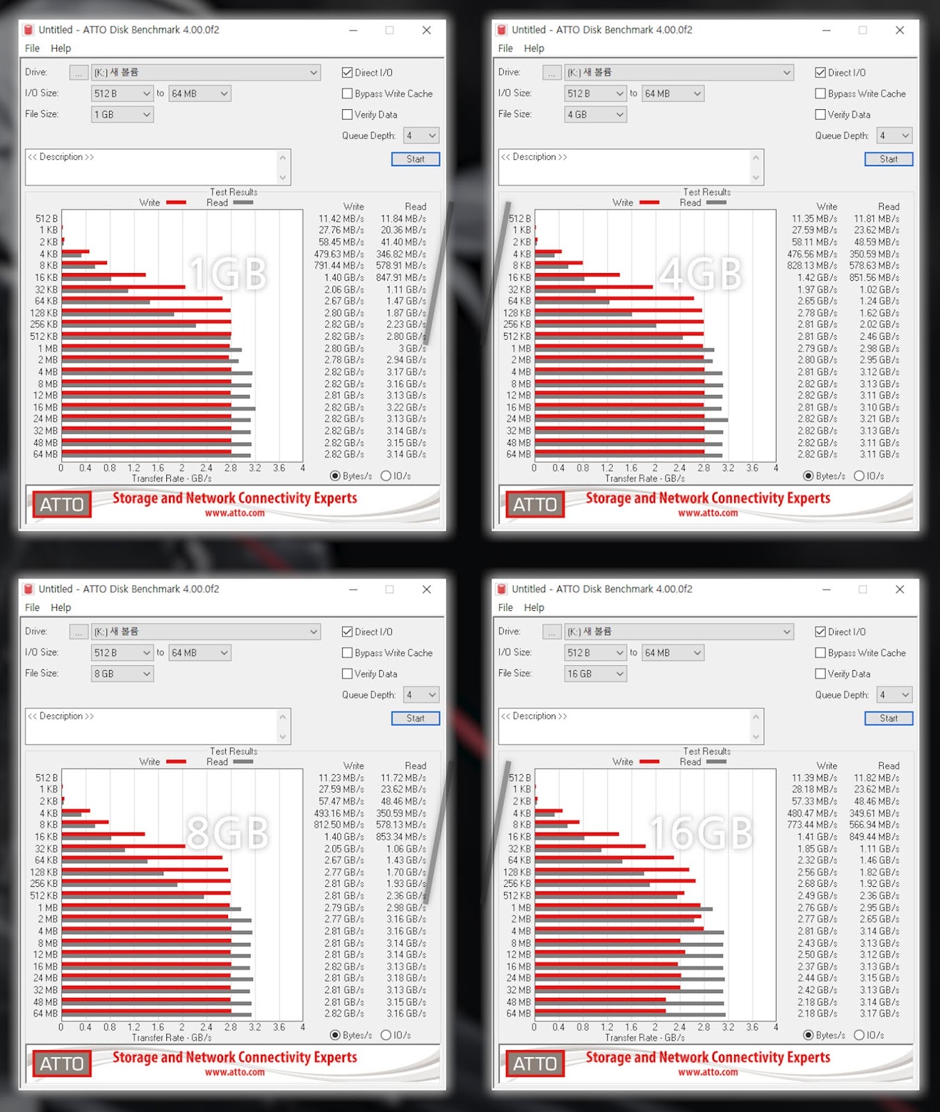 ¡ã ATTO µð½ºÅ©´Â, ¸ñÇ¥ ¿ë·®¿¡ µµ´ÞÇϱâ±îÁöÀÇ ¼º´ÉÀ» ¿©·¯ I/O Å©±â¸¦ ÅëÇØ ÇÑ´«¿¡ È®ÀÎÇÒ ¼ö ÀÖ´Â ÇÁ·Î±×·¥ÀÔ´Ï´Ù. ¸¶Âù°¡Áö·Î, 16GBÀÇ Å×½ºÆ®ºÎÅÍ ¼øÂ÷ ¾²±â ¼Óµµ°¡ °¨¼ÒµÈ ¸ð½ÀÀ» º¸ÀÔ´Ï´Ù.