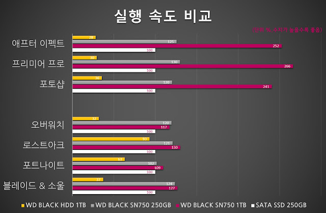 ¡ã ÀϺΠ°ÔÀÓ°ú ÇÁ·Î±×·¥À» ±¸µ¿Çϴµ¥ ¼Ò¿äµÈ ½Ã°£À» ÃøÁ¤ ÈÄ, ¼º´ÉÀ» ºñÀ²·Î Ç¥ÇöÇØºÃ½À´Ï´Ù. SATA3 SSDÀÇ ºñÁßÀ» 100%·Î µÎ°í, °¢ ÀåÄ¡º°·Î ¾î´À Á¤µµÀÇ ¼º´É Â÷À̸¦ º¸ÀÌ´ÂÁö ºñ±³Çß½À´Ï´Ù. °ÔÀÓ Áß, 30%¶ó´Â °¡Àå Å« ºñÀ² Â÷À̸¦ º¸ÀÎ ·Î½ºÆ® ¾ÆÅ©¸¦ º¸¸é, °ÔÀÓ ½ÇÇà ¹öưÀ» Ŭ¸¯ÇÑ ÈÄ, Á¦ÀÛ»ç ·Î°í°¡ ³ª¿À±â±îÁöÀÇ ±¸°£À» ÃøÁ¤ÇßÀ» ¶§, SATA3 SSD¿¡¼ 65.03Ãʰ¡ ¼Ò¿äµÈ ¹Ý¸é, WD BLACK SN750 1TB Á¦Ç°Àº 49.59°¡ ¼Ò¿äµÇ¾ú½À´Ï´Ù. ¶ÇÇÑ, ºí·¹ÀÌµå¾Ø¼Ò¿ï¿¡¼µµ ¾à 15ÃÊÀÇ Â÷À̰¡ ¹ß»ýÇß½À´Ï´Ù.