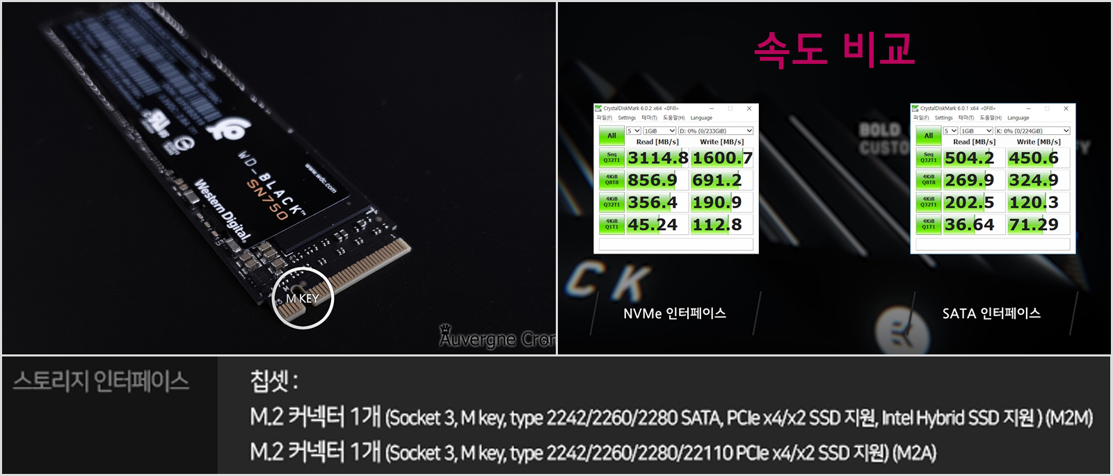 ¡ã WD Black SN750µµ NVMe ÀÎÅÍÆäÀ̽ºÀÇ Á¦Ç°À¸·Î, M.2 ½½·ÔÀ» »ç¿ëÇÕ´Ï´Ù. ¼øÂ÷ Àб⿡¼ SATA ´ëºñ ÃÖ´ë 6¹èÀÇ Â÷À̸¦ º¸À̱⠶§¹®¿¡, SN750ÀÇ Á¦ ¼º´ÉÀ» ¹ßÈÖÇϱâ À§Çؼ´Â, M.2 ½½·Ô Áß, NVMe¸¦ Áö¿øÇÏ´Â ½½·Ô¿¡¼ ÁøÇàÇØ¾ß Á¤»óÀûÀÎ ¼Óµµ¸¦ ü°¨ÇÏ½Ç ¼ö ÀÖ½À´Ï´Ù. º¸ÅëÀº, ¸ÞÀκ¸µå ¸Å´º¾óÀ̳ª, »óǰ DB¿¡¼ È®ÀÎÇÒ ¼ö ÀÖ½À´Ï´Ù. PCIe 3.0x4 32GT/s³ª Ultra M.2·Î Ç¥±âµÇ¾î ÀÖÀ¸¸ç, ´ëºÎºÐÀÇ ¿äÁò º¸µåµéÀº ´Ã¾î³ PCIe ·¹ÀÎÀ¸·Î, °ÅÀÇ ¸ðµç ½½·Ô¿¡¼ NVMe ¼Óµµ¸¦ Áö¿øÇÏÁö¸¸, ¿¹Àü º¸µå¸¦ »ç¿ë ÁßÀ̽öó¸é, È®ÀÎÇØº¸½Ã´Â °Íµµ ³ªÁßÀ» À§ÇØ ÁÁÀ» °Í °°½À´Ï´Ù.