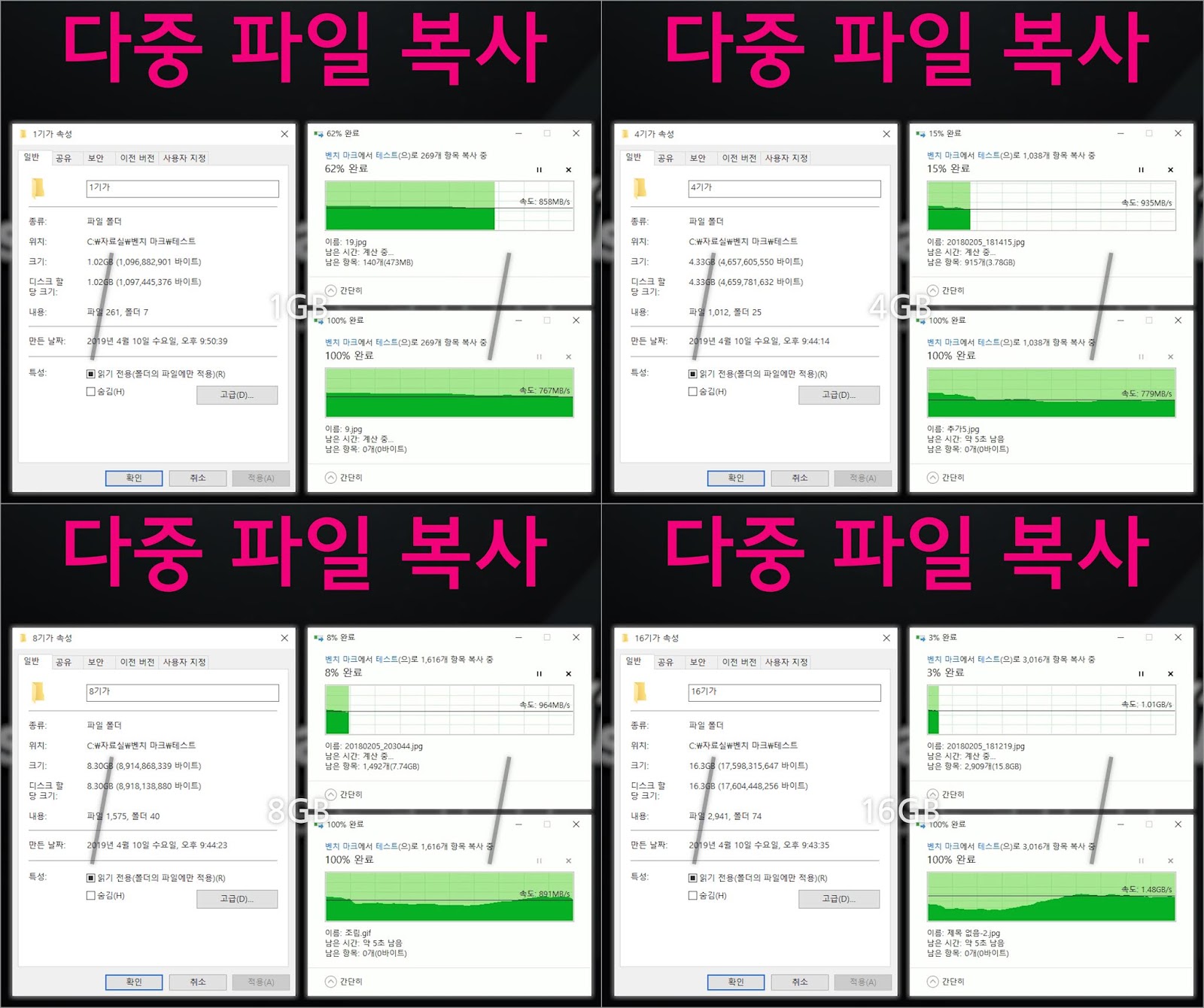¡ã 1GB, 4GB, 8GB, 16GBÀÇ 4°¡Áö ¿ë·®À¸·Î ´ÙÁß ÆÄÀÏ º¹»ç Å×½ºÆ®¸¦ ÁøÇàÇß½À´Ï´Ù. ÇØ´ç Å×½ºÆ®¸¦ ÅëÇØ ÄÁÆ®·Ñ·¯ÀÇ ¾ÈÁ¤¼º°ú SSDÀÇ ·£´ý ¾²±â ¼Óµµ¸¦ ü°¨ÇÒ ¼ö ÀÖ½À´Ï´Ù. ´ë·«ÀûÀÎ ¼Óµµ´Â ±×·¡ÇÁ¸¦ ÅëÇØ È®ÀÎÇÒ ¼ö ÀÖÀ¸¸ç, ´ÙÁß ÆÄÀÏÀº Æò±ÕÀûÀ¸·Î 800MB/s ÀÌ»óÀÇ ¼Óµµ·Î ¼ø½Ä°£¿¡ À̵¿µÇ¾ú½À´Ï´Ù.