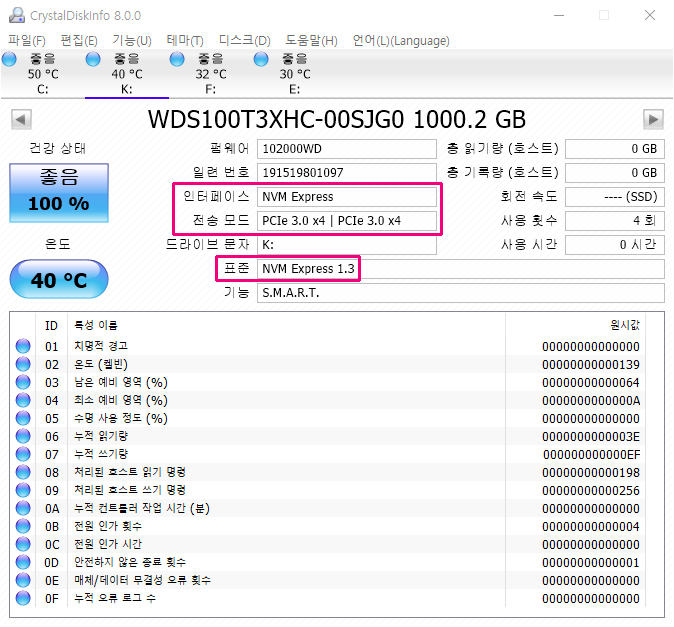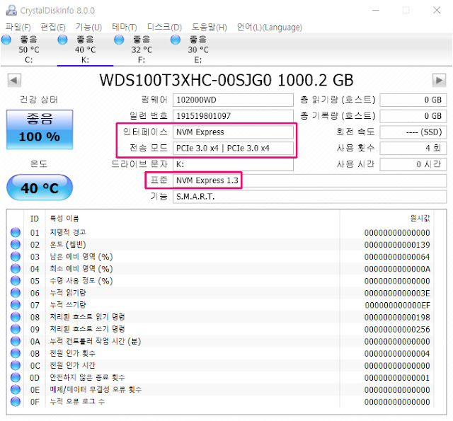 ¡ã ¿ì¼± µð½ºÅ© ÀÎÆ÷ÀÔ´Ï´Ù. ÀÎÅÍÆäÀ̽º¿Í Àü¼Û ¸ðµå¿¡¼ NVMe °¡ Á¤»óÀûÀ¸·Î ÀÎ½ÄµÈ ¸ð½ÀÀ» º¸ÀÔ´Ï´Ù.