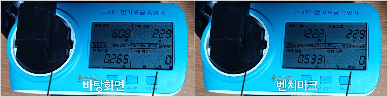 ¡ã À¯ÈÞ ½Ã ¼ÒºñÀü·ÂÀº 60.8W, º¥Ä¡¸¶Å© ½Ã¿¡´Â 122.2W·Î ÃøÁ¤µÇ¾ú½À´Ï´Ù.