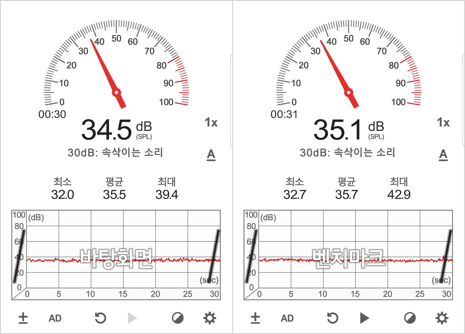 ¡ã AIDA64 ¾ÈÁ¤¼º Æò°¡ ¹× CINEBENCH R20À» ±¸µ¿ÇÏ¿© ÃøÁ¤À» ÁøÇàÇß½À´Ï´Ù. Àü¿ø OFF ½Ã ½Ç³» ¼ÒÀ½Àº Æò±Õ 34.9dBÀ¸·Î Å©°Ô Â÷À̰¡ ¾øÀ» Á¤µµ·Î Á¤¸» Àú¼ÒÀ½ÀÇ Á¦Ç°À̸ç, ¹ÙÅÁȸé°ú º¥Ä¡¸¶Å© ½ÃÀÇ Â÷ÀÌ ¶ÇÇÑ Á¤¸» ¹Ì¼¼ÇÏ°Ô ¹ß»ýÇß½À´Ï´Ù. ¼ÒÀ½ ÃøÁ¤Àº ÆÄ¿ö¼ÇöóÀÌ¿Í 3CM °£°ÝÀ» µÎ°í ÁøÇàÇß½À´Ï´Ù. Á¤È®ÇÑ ÃøÁ¤ ±â±¸¸¦ ÀÌ¿ëÇÏ¿© ÃøÁ¤ÇÑ °ÍÀº ¾Æ´Ï°í, ¸ð¹ÙÀÏ ¾ÖÇø®ÄÉÀ̼ÇÀ» ÀÌ¿ëÇÏ¿© ÃøÁ¤Ç߱⠶§¹®¿¡ ½ÇÁ¦ ü°¨ÇÏ´Â Á¤µµ¿Í Â÷À̰¡ ÀÖ´Ù´Â °Í Á¤µµ·Î¸¸ Âü°íÇØÁÖ½Ã±æ ¹Ù¶ø´Ï´Ù.