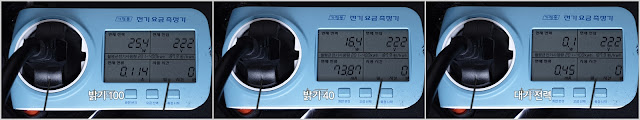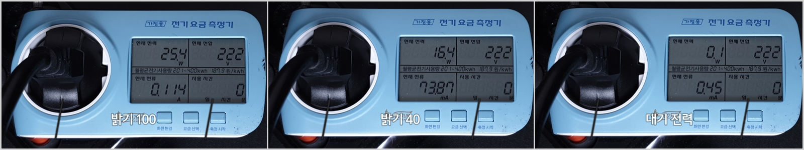 ¡ã ¹à±â¸¦ 100À¸·Î ¼³Á¤ÇßÀ» ¶§´Â 25.4W, 40ÀÏ ¶§´Â 16.4WÀÇ ¼Òºñ Àü·ÂÀÌ ÃøÁ¤µÇ¾ú½À´Ï´Ù. ¶ÇÇÑ, ´ë±âÀü·ÂÀº 0.1W·Î ÃøÁ¤µÇ¾ú½À´Ï´Ù.